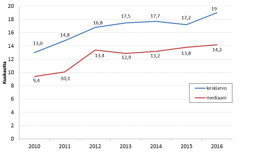 Aluehallintovirastojen käsittelemien ympäristölupahakemusten käsittelyajat ovat käytännössä pidentyneet koko virastojen olemassaolon ajan vuodesta 2010 alkaen. Kuvassa 1 on esitetty ympäristölupahakemusten käsittelyaikojen keskiarvot ja mediaaniarvot aluehallintovirastojen vuosina 2010—2016 antamissa ympäristönsuojelulain mukaisissa lupapäätöksissä.