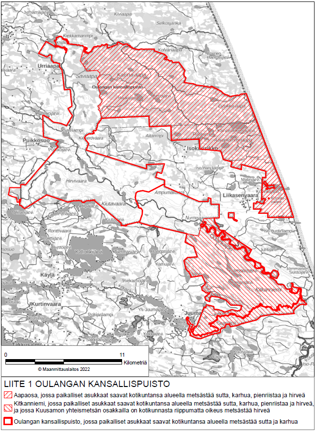 Hallituksen esityksessä ehdotetaan, että metsästystä koskevat aluekohtaiset erityissäännökset säilytetään pääasiassa ennallaan. Metsästysoikeudet on säilytetty esityksessä pääosin nykyisellään niitä laajentamatta tai vastaavasti asettamatta oikeuksille tiukempia rajoituksia. Oulangan kansallispuistossa hirvenmetsästyksen alue kuitenkin laajenee hieman säännöksen selkeyttämisen vuoksi. Hirvenajo ehdotetaan esityksessä säilytettävän nykytilan mukaisesti kiellettynä Nuuksion ja Kolin kansallispuistoissa puistojen korkeiden kävijämäärien vuoksi. Uuden luonnonsuojelulain 51 §:n 1 momentin 3 kohdan nojalla Metsähallitus voi kuitenkin myöntää lupia Nuuksion ja Kolin kansallispuistoon hirven ja valkohäntäkauriin poistoon, jos se on tarpeen hirvieläinten liikenteelle aiheuttamien vahinkojen torjumiseksi. Lisäksi Sodankylässä sijaitsevan Sompion luonnonpuiston riekon ansapyynnin sallivasta poikkeuksesta ehdotetaan luovuttavaksi, koska riekon ansapyynti on metsästyslainsäädännössä sallittu vain Enontekiön, Inarin ja Utsjoen kuntien alueella.