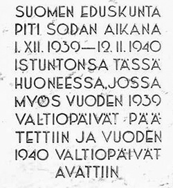 På uppdrag av riksdagen gjordes och fästes en minnesplatta över vinterkriget i plenisalen 1.10.1940. Bild: Keijo Jaakola.