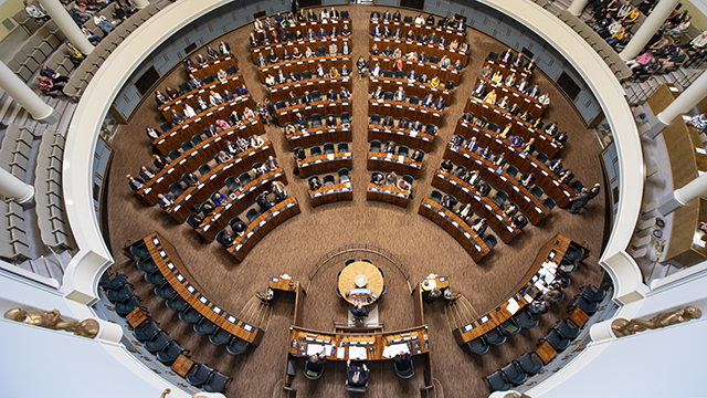 Riksdagen stiftar alla lagar i Finland och fastställer statsbudgeten. Riksdagen väljer statsminister och utövar kontroll över regeringens verksamhet. Riksdagen godkänner också de viktigaste av de internationella överenskommelser som är bindande för Finland och är med och påverkar EU-frågor.