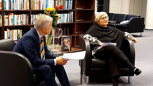 ​Också det här är en form av informationstjänst. Förste informationsspecialist Timo Turja intervjuar talman Anu Vehviläinen vid evenemanget Boksamtal.