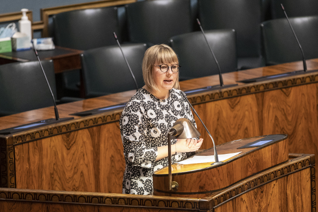 Arbetslivs- och jämställdhetsutskottets ordförande Aino-Kaisa Pekonen (vänst) presenterade utskottets betänkande i plenum.