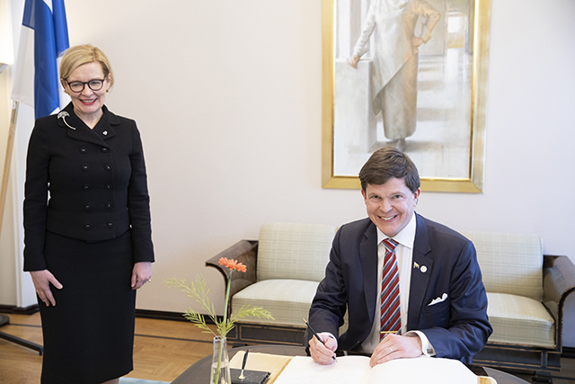 Under sitt finlandsbesök träffar Norlén även representanter för grundlagsutskottet, utrikesutskottet och framtidsutskottet samt republikens president Sauli Niinistö och försvarsminister Jussi Niinistö (blå). På programmet står också ett besök i Mannerheimmuseet.