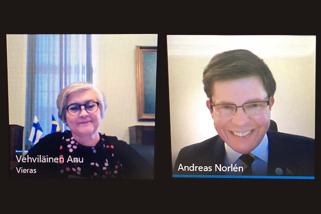 Riksdagens talman Anu Vehviläinen diskuterade med talmannen för Sveriges riksdag Andreas Norlén onsdagen den 18 november. På grund av det rådande coronaläget träffades talmännen på distans.