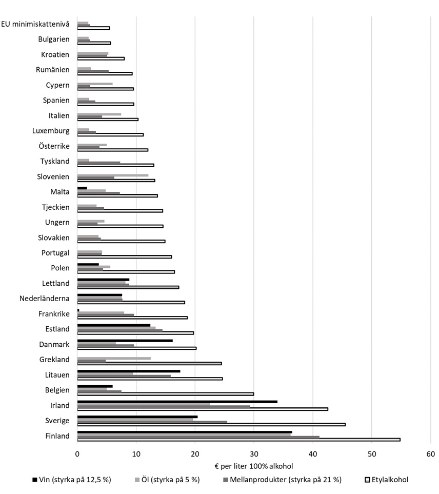 Även om alkoholbeskattningen har harmoniserats i unionen, varierar nivån på alkoholbeskattningen betydligt mellan EU:s medlemsstater. De ovannämnda minimiskattesatserna är låga och de har inte ens höjts nominellt sedan skattesatsdirektivet antogs 1992. Figur 1 nedan visar skattenivåerna i EU:s medlemsstater för vissa alkoholdrycker vid ingången av 2024 per liter hundraprocentig alkohol. Såsom det framgår av figuren varierar beskattningen av alkoholdrycker i alla medlemsländer på ett betydande sätt beroende på framställningssättet. Drycker i gruppen etylalkoholdrycker beskattas vanligen hårdare än vin och öl. Drygt hälften av EU:s medlemsstater beskattar inte vin alls, och i många medlemsstater är skatten på öl låg. Av figuren framgår också att i Finland är beskattningen av alkohol hårdast.