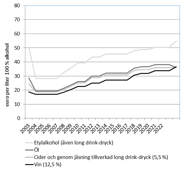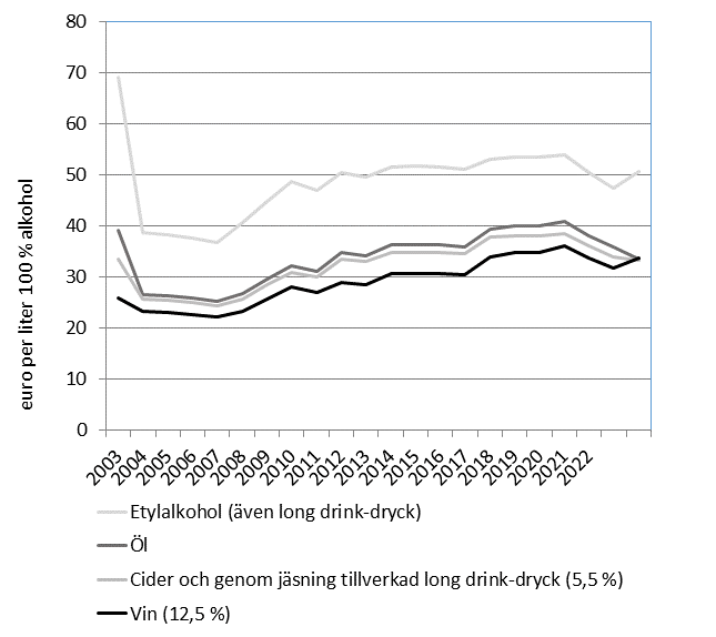 I Sverige höjdes skatten på öl, vin, andra genom jäsning tillverkade drycker och mellanprodukter med cirka fem procent vid ingången av 2023 och med cirka åtta procent vid ingången av 2024. Skatten på etylalkohol höjdes med cirka en procent både vid ingången av 2023 och vid ingången av 2024. Skattenivån för alkoholskatten i Sverige var temporärt indexbunden 1994–1998 för att bibehålla den reella skattenivån, men för närvarande är alkoholskatten inte indexbunden.