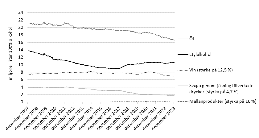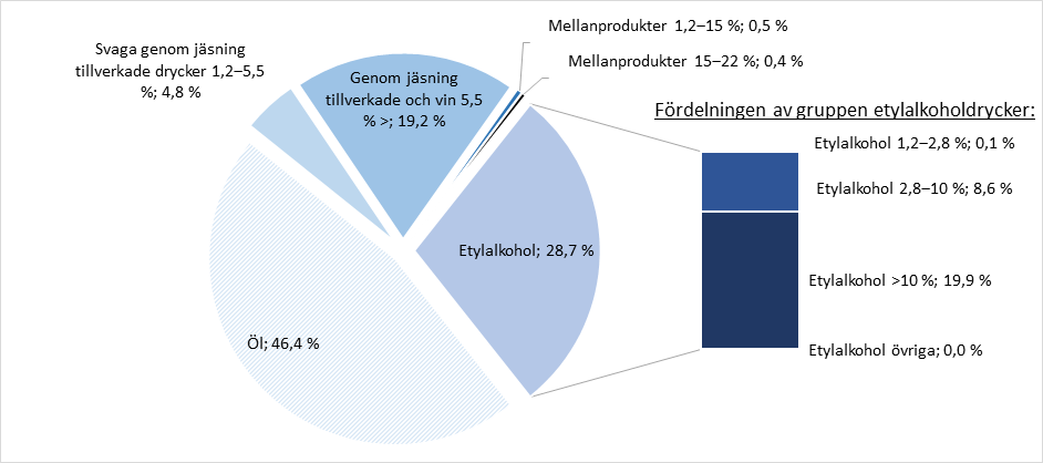 Granskat som hundraprocentig alkohol består något under hälften av den skattepliktiga konsumtionen av alkohol av ölkonsumtion, vilket framgår nedan av figur 4. Andelen vin och svaga genom jäsning tillverkade drycker utgör cirka en fjärdedel. Mellanprodukternas andel av den skattepliktiga konsumtionen är cirka en procent, varav hälften består av drycker som innehåller mindre än 15 procent alkohol och cirka hälften av drycker som innehåller 15–22 procent alkohol. Andelen för gruppen etylalkoholdrycker är ca 29 procent, varav det uppskattas att något under en tredjedel har en alkoholhalt på högst 10 procent. Till gruppen etylalkoholdrycker hör dessutom svaga drycker som innehåller mer än 1,2 men högst 2,8 volymprocent alkohol samt etylalkoholdrycker i produktgrupp 46, men deras andel av hela gruppen etylalkoholdrycker är marginell, sammanlagt under en halv procent.