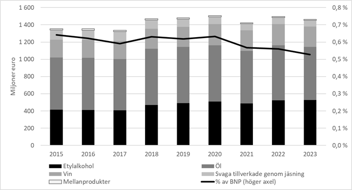 År 2023 uppgick intäkterna av skatten på alkohol till omkring 1 463 miljoner euro. Grupperna öl och etylalkohol står för sammanlagt nästan 80 procent av skatteintäkterna. Skatteintäkterna för gruppen etylalkoholdrycker uppgick till ca 530 miljoner euro 2023 och har ökat klart mest efter 2015, med cirka 120 miljoner euro, dvs. med knappt 30 procent. Endast en liten del av ökningen förklaras av skattehöjningar, och den främsta orsaken är den ökning av konsumtionen av long drink-drycker som skett efter att alkohollagen ändrades. Samtidigt har konsumtionen och skatteintäkterna av svaga drycker som tillverkats genom jäsning minskat mest. Intäkterna från skatten på mellanprodukter uppgick till ca 12 miljoner euro 2023. Av intäkterna från skatten på mellanprodukter inflyter cirka hälften från den grupp drycker som innehåller högst 15 volymprocent alkohol och hälften från den grupp drycker som innehåller över 15 volymprocent alkohol. Figur 5 nedan åskådliggör utvecklingen av intäkterna från alkoholskatten och fördelningen av intäkterna enligt grupp av drycker 2015–2023.
