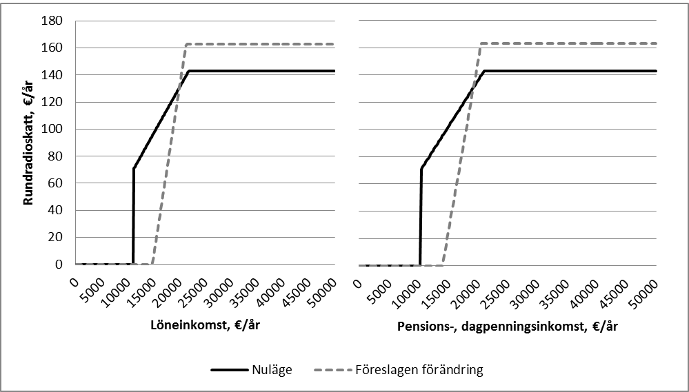 Den föreslagna ändringen innebär att tröskeln för rundradioskatten för löneinkomster stiger från nuvarande 11 044 euro till 14 750 euro. I fråga om pensions- och dagpenningsinkomsten stiger tröskeln från nuvarande 10 294 euro till 14 000 euro. Till följd av förslaget minskar antalet personer som betalar rundradioskatt med cirka 390 000. Ändringen ökar de disponibla inkomsterna för dessa personer med minst 70 euro per år. Eftersom beloppet för det minsta skattebelopp som debiteras frångås, ger rundradioskatten i motsats till nuläget inte upphov till mycket hög marginalskatt när det gäller tröskeln för betalning av skatten.