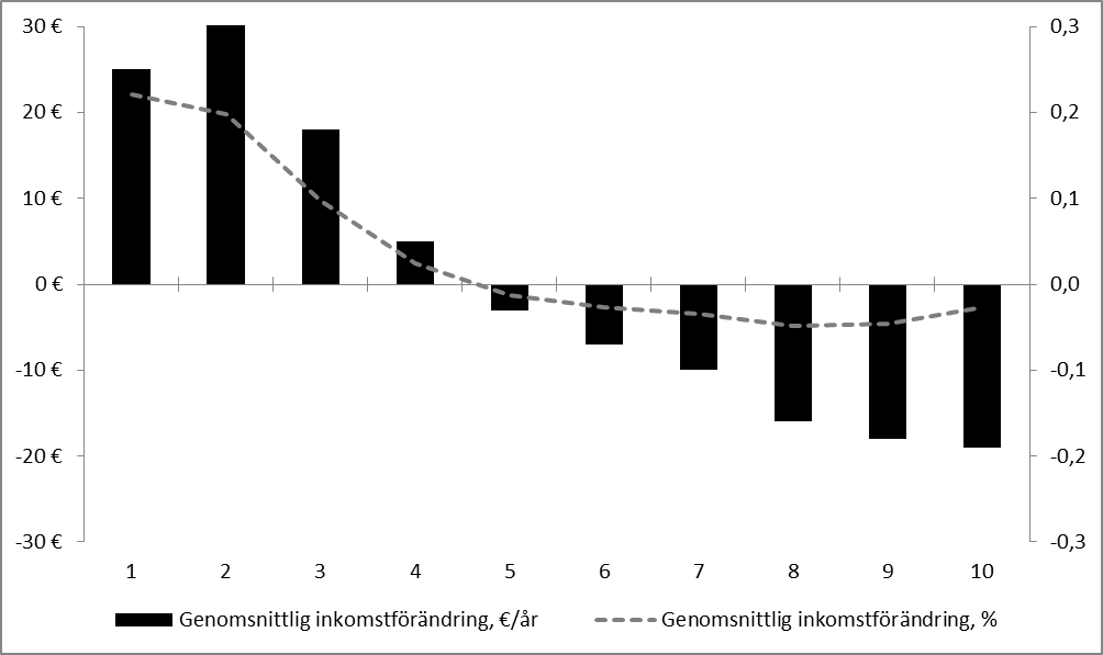 Förslaget minskar inkomstskillnaderna något, mätt med Ginikoefficienten, -0,03 procentenheter. I tabellen nedan presenteras den föreslagna ändringens effekt på disponibla inkomster per inkomstdecil.