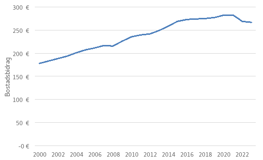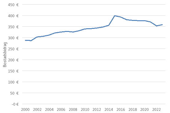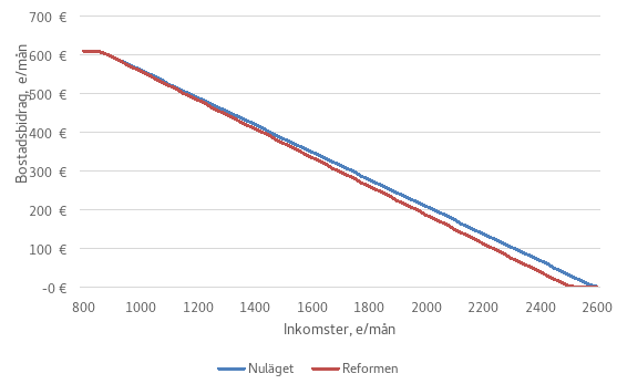 I kommungrupp II är den maximala boendeutgiften för enpersonshushåll 447 euro i månaden och i kommungrupp III 394 euro i månaden. Om bidragstagarens faktiska boendeutgifter överstiger 447 euro i månaden och han eller hon med beaktande av inkomsterna får fullt bostadsbidrag, minskar bidraget från nuvarande 312,9 euro till 275,8 euro i månaden. Storleken på förändringen beror på hushållets storlek, inkomster och boendeutgifter.