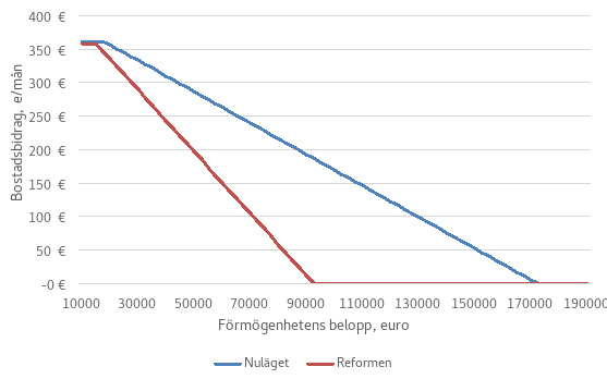 Återinförandet av förmögenhetsprövningen minskar bostadsbidraget och de disponibla inkomsterna för hushåll vars nettoförmögenhet överstiger 10 000 euro eller 20 000 euro, om hushållet har minst två vuxna. Från tillgångarna avdras skulderna och på basis av beloppet av den nettoförmögenhet som fås på detta sätt läggs kalkylerad inkomst till hushållets övriga bruttoinkomster.