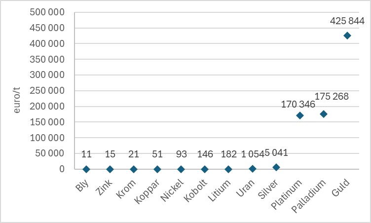 Eftersom metallmalmernas beskattningsvärden baserar sig på världsmarknadspriserna, varierar deras skattenivåer i euro enligt värdet på förädlade metaller. De skattenivåer i euro som räknats utifrån de beskattningsvärden som Skatteförvaltningen fastställt för år 2025 per ton metall som ingår i malm för vilken anrikningsprocessen inletts varierar så som framgår av figur 1 från 11 euro för bly till omkring 426 000 euro för guld.