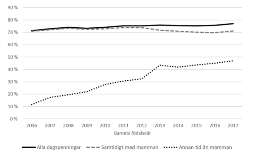 Eftersom faderskapspenning kan fås tills barnet fyller två år och användningen av faderskapspenning kan delas upp på flera kalenderår, är det vettigt att granska pappornas dagpenningsanvändning enligt barnets födelseår. Av papporna till barn födda 2017 utnyttjade cirka 77 procent föräldradagpenning Faderskaps- eller föräldrapenning för någon tid. Av dem tog 47 procent ut någon del av dagpenningsdagarna under en annan tid än mamman. Vid en granskning av dem som fick enbart faderskapspenning så fick 46 % någon del av faderskapspenningen under en annan tid än moderskaps- och föräldrapenningsperioden.