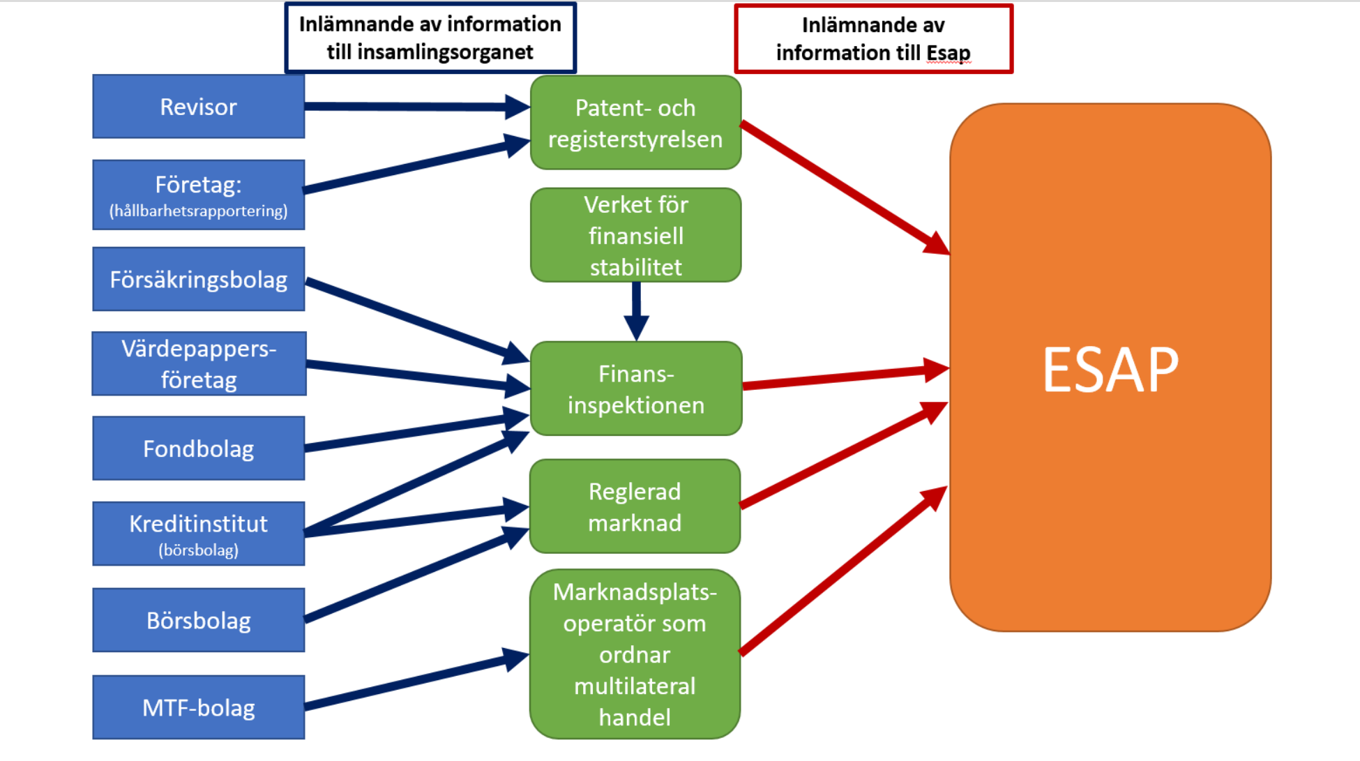 De aktörer och myndigheter som avses i de ovan förtecknade EU-rättsakterna är skyldiga att lämna in information som baserar sig på rättsakterna i fråga till de insamlingsorgan som avses i bestämmelserna. I en del av bestämmelserna har insamlingsorganet definierats som behörig myndighet, resolutionsmyndighet, offentligt register, Europeiska värdepappers- och marknadsmyndigheten, Europeiska bankmyndigheten, Europeiska försäkrings- och tjänstepensionsmyndigheten eller en i direktiv 2004/109/EG