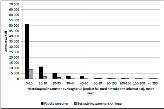 Enligt skattedeklarationsuppgifterna för 2014 gick cirka 41 procent av skogsbruken på vinst och 59 procent på förlust. Förlusten av skogsbruk uppgick i cirka 99 procent av fallen till högst 20 000 euro per år. Nettokapitalinkomsterna av skogsbruk uppgick i cirka 84 procent av fallen till högst 20 000 euro per år. Förlusterna av skogsbruk per skattskyldig är små räknat i euro, i genomsnitt cirka 1 000 euro på årsnivå och medianförlusten cirka 400 euro. Nettokapitalinkomsten av skogsbruk var i genomsnitt cirka 10 800 euro och medianinkomsten 4 600 euro.