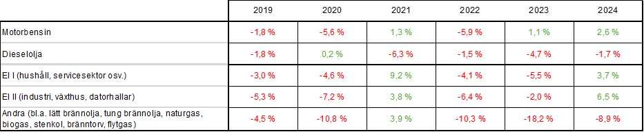 Avvikelserna i prognoserna för energiskatteinkomsterna under budgetåret och ramperioden jämfört med utfallet har i regel varit små på samma sätt som i fråga om övriga punktskatter. Detta beror i huvudsak på att även om de årliga ändringarna i skattebasen för energibeskattningen, på det sätt som beskrivs ovan, är ganska stora, är de i huvudsak förutsebara på kort sikt. Dessutom följs skattebasen samt förbrukningen av olika energiprodukter och el upp, bedöms och förutspås i realtid på en mycket detaljerad nivå. Däremot är prognoserna på längre sikt oundvikligen förenade med betydande osäkerhetsfaktorer. När det gäller energiprodukter kommer skattebasen enligt prognoserna att som helhet klart minska på lång sikt. Däremot kommer skattebasen för el att öka. Som helhet innebär prognoserna att skatteintäkterna från den nuvarande försörjningsberedskapsavgiften sannolikt kommer att minska både nominellt och reellt på medellång sikt.
