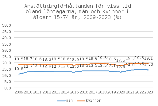 Könsskillnaderna i utbredningen av anställningsförhållanden för viss tid förklaras delvis av att den finländska arbetsmarknaden är indelad i kvinno- och mansdominerade branscher och av de familjeledigheter som till största delen tas ut av kvinnor och skapar ett behov av vikariat. Sutela, H., Viinikka, J. & Pärnänen, A. Työolot murrosten keskellä – Työolotutkimuksen tuloksia 1977–2023, 60–62. Helsingfors: Statistikcentralen. Enligt Statistikcentralens Arbetskraftsundersökning är anställningsförhållandena för viss tid inom den privata sektorn fördelade relativt jämnt mellan män och kvinnor, medan fler kvinnor än män är visstidsanställda inom den offentliga sektorn. Anställningsförhållanden för viss tid är klart vanligare än i snitt även i olika befolkningsgrupper, bland annat bland personer med invandrarbakgrund. Till exempel enligt enkätundersökningen från år 2022 av EU:s byrå för grundläggande rättigheter är andelen anställningsförhållanden för löntagare av afrikansk bakgrund över två gånger större än bland hela befolkningen.