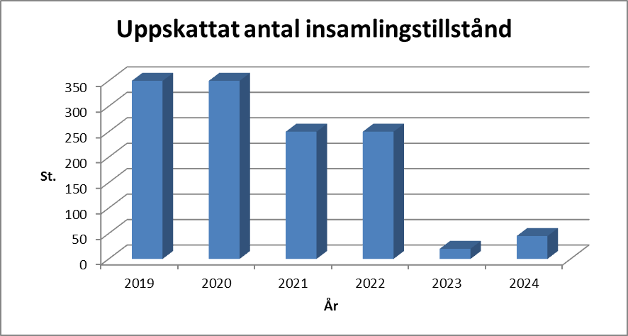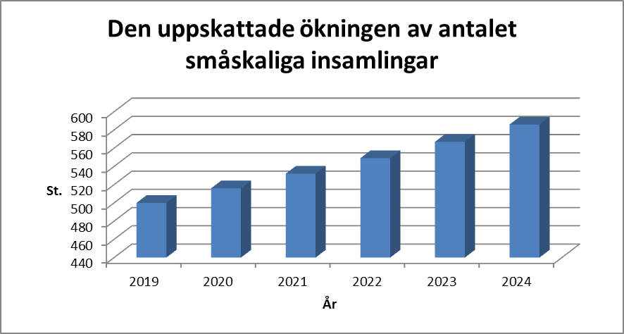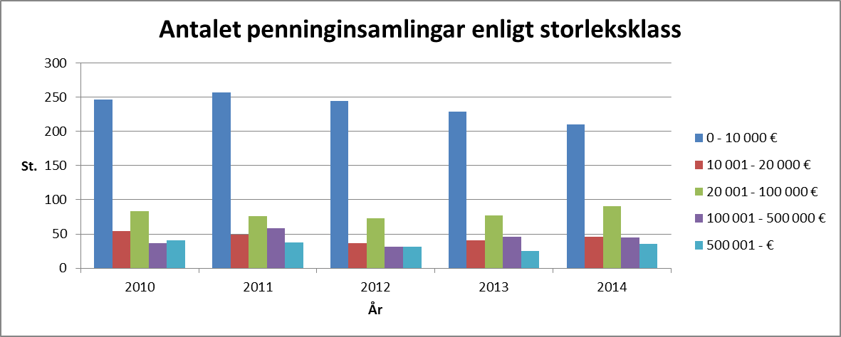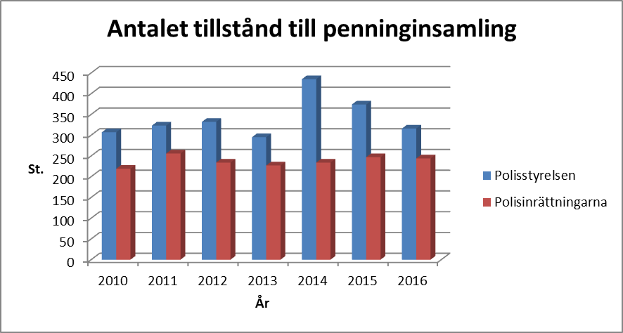 Antalet beviljande tillstånd till penninginsamling har sakteligen ökat de senaste åren. Polisstyrelsen har beviljat i medeltal cirka 340 och polisinrättningarna cirka 240 tillstånd per år.