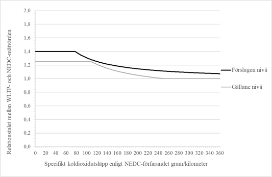 Diagram 1. Relationen mellan koldioxidutsläppen enligt WLTP- och enligt NEDC-förfarandet på olika utsläppsnivåer i gällande och föreslagen anpassning.