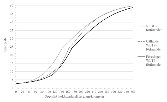 För att bilbeskattningens genomsnittliga nivå dock inte ska stramas åt jämfört med läget innan det nya mätförfarandet infördes, föreslås det att skattetabell 1 A som tillämpas på person- och paketbilar som beskattas enligt WLTP-förfarandet ändras på det sätt som föreslås i utredningen. Skattesatsen blir lägre än tidigare på alla utsläppsnivåer. Störst blir skillnaden för nya bilar med utsläppsnivåer som överskrider det genomsnittliga. Skillnaden mellan gällande och föreslagen skattekurva 2019 åskådliggörs i diagram 2.