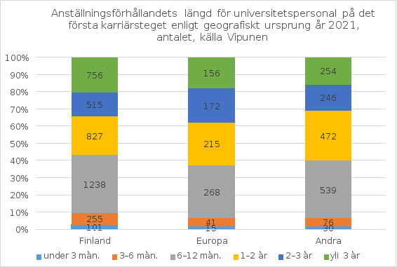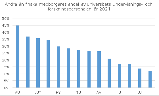 Andra än finska medborgares andel av universitetspersonalen år 2021 (källa: Vipunen).