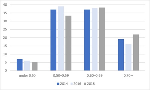 Antalet anställda inom äldreomsorgen har följts upp sedan 2014. Den faktiska dimensioneringen under de fyra första åren har varit närapå oförändrad, men 2018 ökade antalet enheter som uppnått en dimensionering på 0,7 anställda något.