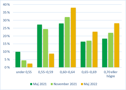 Figur 2. Dimensioneringen av personalen vid verksamhetsenheterna med heldygnsomsorg i maj och november 2021 samt i maj 2022.