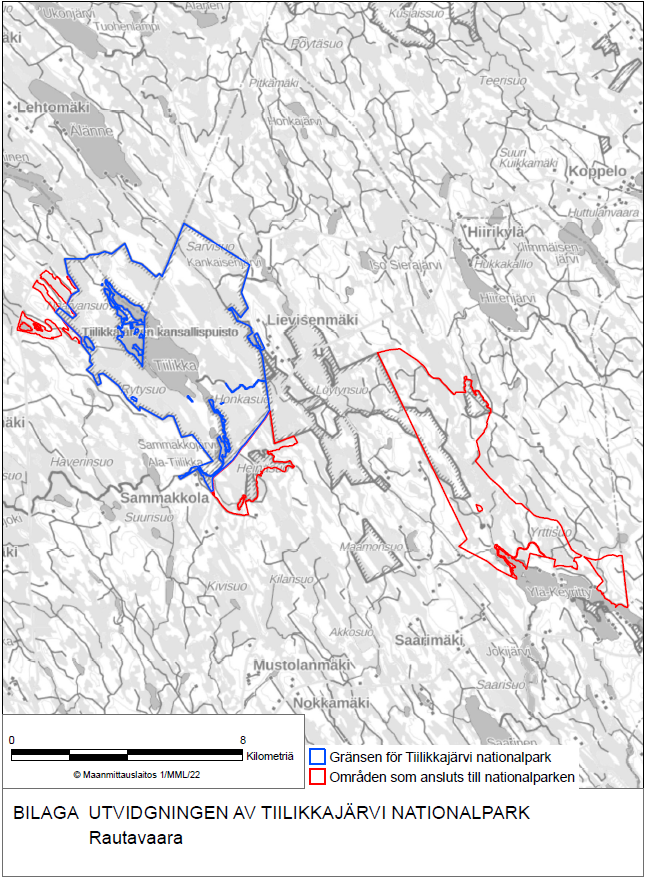 Vid den fortsatta beredningen av proposition bevarades gränserna för utvidgningen av nationalparken i huvudsak i enlighet med den ursprungliga propositionen och de gränser som kommunen föreslagit i sin Master Plan. Propositionen i fråga har lokalt stöd och den främjar i högsta grad regeringsprogrammets mål att stoppa förlusten av biologisk mångfald genom att i betydande utsträckning utöka arealen för skyddade områden. I förslaget till gränser för området har dessutom de lokala jägarnas behov beaktats. I och med remissyttrandena gjordes dock vissa tekniska ändringar i fråga om gränserna. I förslaget till utvidgning ströks det område som ungdomscentret Metsäkartano har arrenderat (29 hektar) för att möjliggöra fortsatt utveckling av centret samt generalplanens område för fritidsbostäder (1 hektar) och det område som ingår i utvidgningen och ändringen av detaljplanen för Ylä-Keyritty (planen för Metsäkylä, 11 hektar). Till utvidgningsförslaget fogades Metso-objektet (10 hektar) i Sammakkosuo, som gränsar till Tiilikka Natura-område.