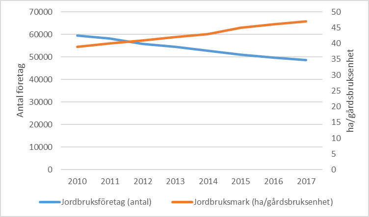 Figur: Jordbruks- och trädgårdsföretag och jordbruksmark i deras bruk 2010—2017. Aktiva gårdsbruksenheter vars ekonomiska storlek är minst 2 000 euro.