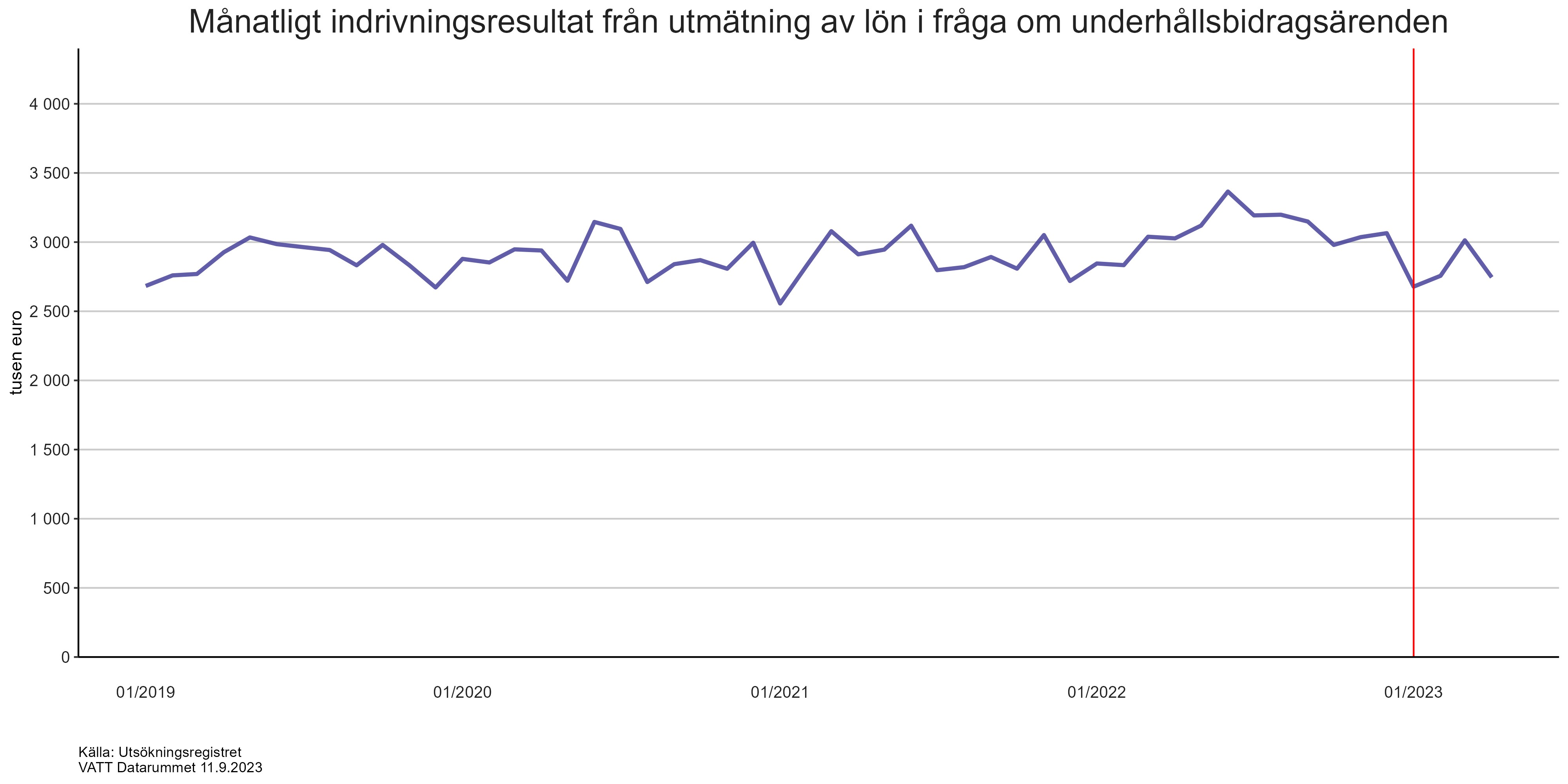 I följande graf presenteras det månatliga indrivningsresultatet av utmätning av lön i fråga om underhållsbidragsskulder från och med januari 2019. Av grafen framgår att höjningen av det skyddade beloppet har minskat indrivningsresultatet av utmätning av lön, men på längre sikt är förändringen inte särskilt dramatisk.