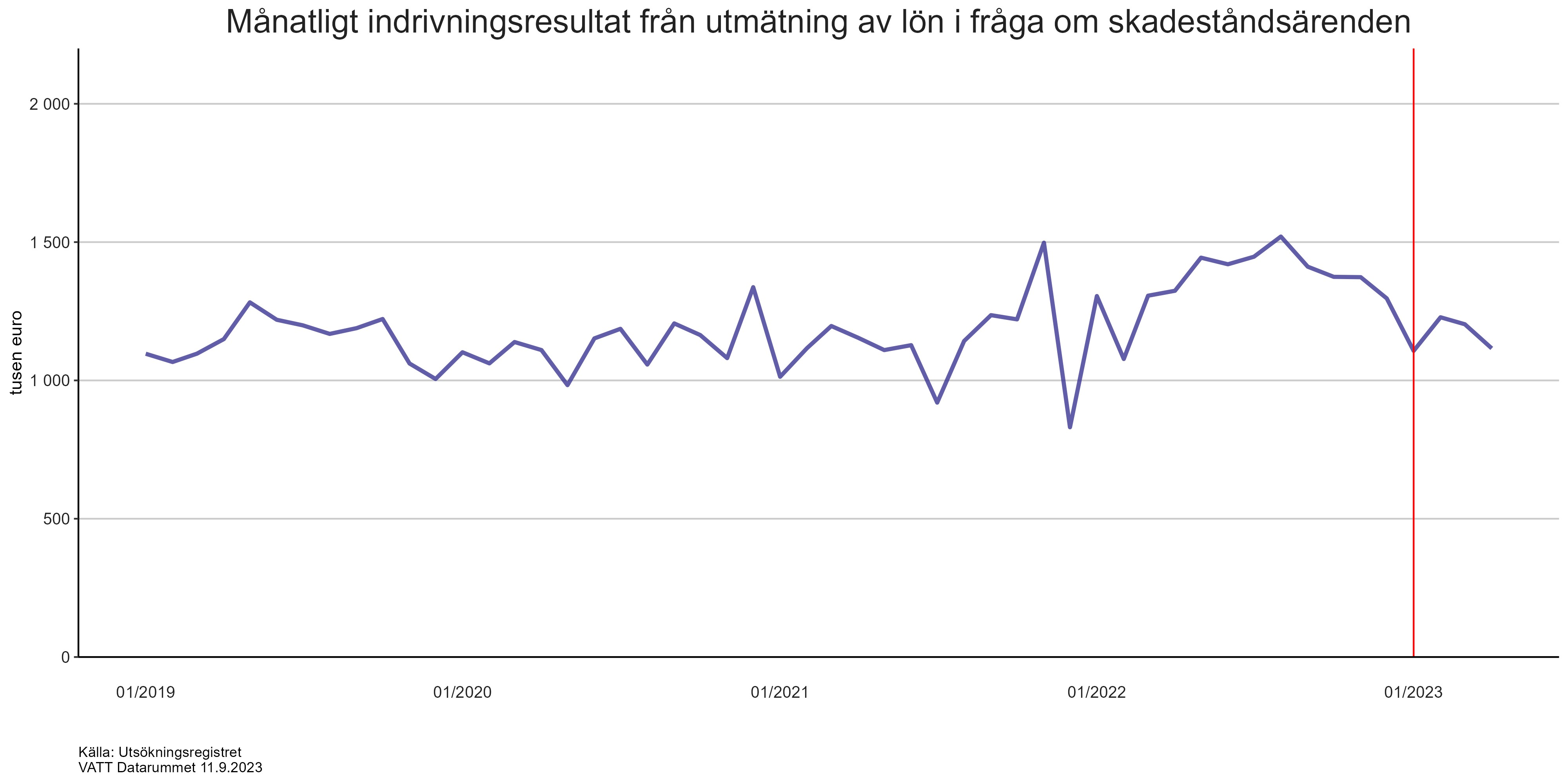 För skadeståndsärenden flöt det i början av 2023 in 7,2 procent mindre (360 000 euro) från utmätning av lön än under motsvarande tidpunkt 2022. I följande graf presenteras det månatliga indrivningsresultatet av utmätning av lön i fråga om skadeståndsärenden från och med januari 2019.