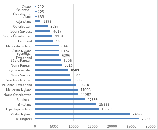 I figur 14 anges landskapsvis antalet tjänsteproducenter som landskapets invånare anlitar för de allmänläkartjänster och specialistläkartjänster inom allmänmedicin som tillhandahålls inom den privata hälso- och sjukvården. Välfärdsområdet eller landskapet bestäms enligt patientens bostadsort. Samma läkare eller tjänsteproducent kan således synas i uppgifterna från flera landskap på grund av att patienter reser över regiongränserna. Med tjänsteproducent avses verksamhetsställe. I hela landet betalades 2024 ersättning till 564 tjänsteproducenter för besök hos allmänläkare eller specialister i allmänmedicin.