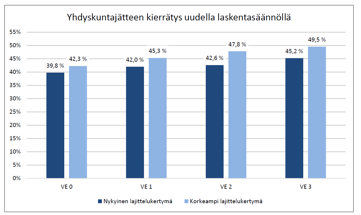 Enligt artikel 11 i avfallsdirektivet sker en åtstramning av målsättningen för förberedelse för återanvändning och materialåtervinning (härefter återanvändning) från nuvarande (50 procent år 2020) stegvis så att målsättningen är 55 procent 2025, 60 procent 2030 och 65 procent 2025. Enligt avfallsdirektivets nya artikel 11 a ska uträkningen av återanvändningsgraden för avfall från 2020 räknas ut på ett enhetligt sätt så att det gäller allt kommunalt avfall. Samtidigt avstår man från de nuvarande fyra alternativa uträkningssätten för uppföljning av att målsättningen uppnås. Den nuvarande målsättningen för 2020 med uträkningsmetoderna förblir oförändrad. Detaljerade regler för beräkning och rapportering av uppgifter om avfall ges i Kommissionens genomförandebeslut (EU) 2019/1004 Kommissionens genomförandebeslut (EU) 2019/1004 av den 7 juni 2019 om fastställande av regler för beräkning, verifiering och rapportering av uppgifter om avfall i enlighet med Europaparlamentets och rådets direktiv 2008/98/EG och om upphävande av kommissionens genomförandebeslut C(2012) 2384 (EUT L 163, 20.6.2019, s. 66). Medlemsstaterna ska inrätta ett ändamålsenligt system för kvalitetskontroll och uppföljning, som kan bestå exempelvis av elektroniska register, tekniska specifikationer av kvalitetskraven för sorterat avfall eller genomsnittliga förlusttal för sorterat avfall.