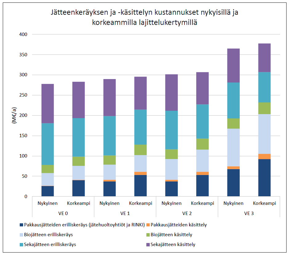 Den centrala förändringen är definitionen av allmänna minimikrav för system för utökat producentansvar i artikel 8 a i avfallsdirektivet. Producenten ska stå för de verkliga kostnaderna för avfallshanteringen från separat insamling framåt för de produkter som släpps ut på unionens marknad. Medlemsstaterna kan avvika från producenternas totala kostnadsansvar om detta är befogat på grund av behovet att säkerställa god avfallshantering och den ekonomiska bärkraften för systemet för utökat producentansvar. Producenterna ska bära minst 80 procent av de nödvändiga kostnaderna för de system för utökat producentansvar som inrättats för att uppnå avfallshanteringsmål i unionslagstiftningsakter av typ producentansvar för producenter av förpackningar. Bestämmelserna om kostnadsansvar tillämpas dock inte på system för producentansvar som grundats i enlighet med unionens lagstiftning för elektrisk och elektronisk utrustning, fordon eller batterier och ackumulatorer. I nationella system för producentansvar som grundats före den 4 juli 2018, såsom systemen för producentansvar för papper och däck i Finland, får den andel som producenterna betalar inte underskrida 50 procent av kostnaderna. De system för producentansvar som grundats före den 4 juli 2018 ska uppfylla minimikraven i artikel 8 a i avfallsdirektivet senast den 5 januari 2023. Enligt artikel 7 punkt 2 i förpackningsdirektivet ska medlemsstaterna säkerställa att system för utökat producentansvar inrättas för alla förpackningar före utgången av 2024.