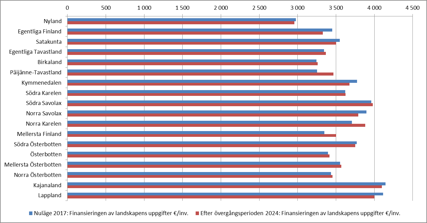År 2019 kommer den allmänna finansiering som tilldelas landskapen att vara som lägst 2 976 euro/ invånare och som högst 4 144 euro/invånare. Efter övergångsperioden kommer finansieringen att ändras så att den allmänna finansieringen är som lägst 2 956 euro/invånare och som högst 4 096 euro/invånare år 2024. Under övergångsperioden utjämnas skillnaderna mellan landskapen märkbart, vilket gör det möjligt för verksamheten i landskapen att anpassa sig till finansieringsnivån i den kalkylmässiga modellen. Under övergångsperioden på fem år kommer man stegvis att övergå från utgångsnivån för finansieringen till den slutliga finansieringsnivån. Under övergångsperioden kommer enligt aktuella beräkningar den årliga förändringen i finansieringen av ett enskilt landskap att uppgå till högst cirka +45 euro/invånare och −25 euro/invånare.