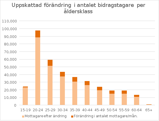 Av bild 10 framgår den uppskattade förändringen i antalet hushåll med allmänt bostadsbidrag till följd av ändringarna. Sammanlagt beräknas ändringarna minska antalet bidragstagare med cirka 50 000 hushåll per månad. Sett har antalet bidragstagare påverkas åldersgruppen 20–24-åringar mest. Det är också gruppen med flest bidragstagare. I relation till antalet nuvarande bidragstagare är konsekvenserna ändå större i de äldre åldersklasserna. Av 20–24-åringarna kommer omkring 9 procent färre att få bidrag, medan andelen i åldersgrupperna över 45 år ligger nära 20 procent.