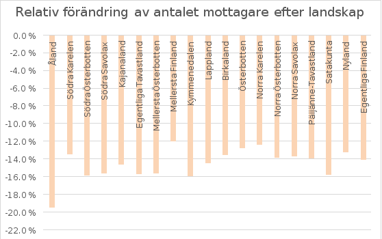 På bild 11 presenteras den uppskattade förändringen i antalet mottagarhushåll efter landskap. Relativt sett faller flest hushåll utanför systemet på Åland och i Södra Österbotten, Södra Savolax, Egentliga Tavastland, Mellersta Österbotten, Kymmenedalen och Satakunta. I euro är skillnaderna mellan landskapen emellertid inte nämnvärda med undantag av Nyland och Åland. I Nyland minskar bidraget med i genomsnitt 103 euro per hushåll (94 euro på Åland). I övriga landskap på fastlandet är förändringen i genomsnitt 70–79 euro per hushåll.