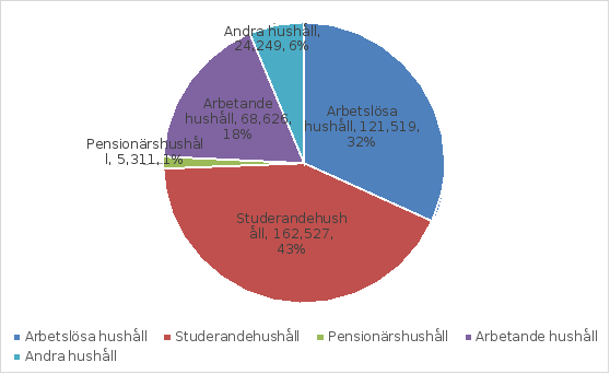Som framgår av tabellen är det mest vanligt bland arbetslösa att få utkomststöd. Mer än 70 procent av de hushåll som fick utkomststöd och där allmänt bostadsbidrag hade beaktats som inkomst var arbetslösa hushåll. De flesta var ensamboende arbetslösa. Det är också vanligt att ensamförälderhushåll får utkomststöd. De som får utkomststöd är i genomsnitt äldre än andra mottagare av allmänt bostadsbidrag, vilket i synnerhet beror på att det är relativt ovanligt att studerande får utkomststöd. Således kommer studerande relativt sett att påverkas mer än arbetslösa av de genomsnittliga konsekvenser förslagen får.