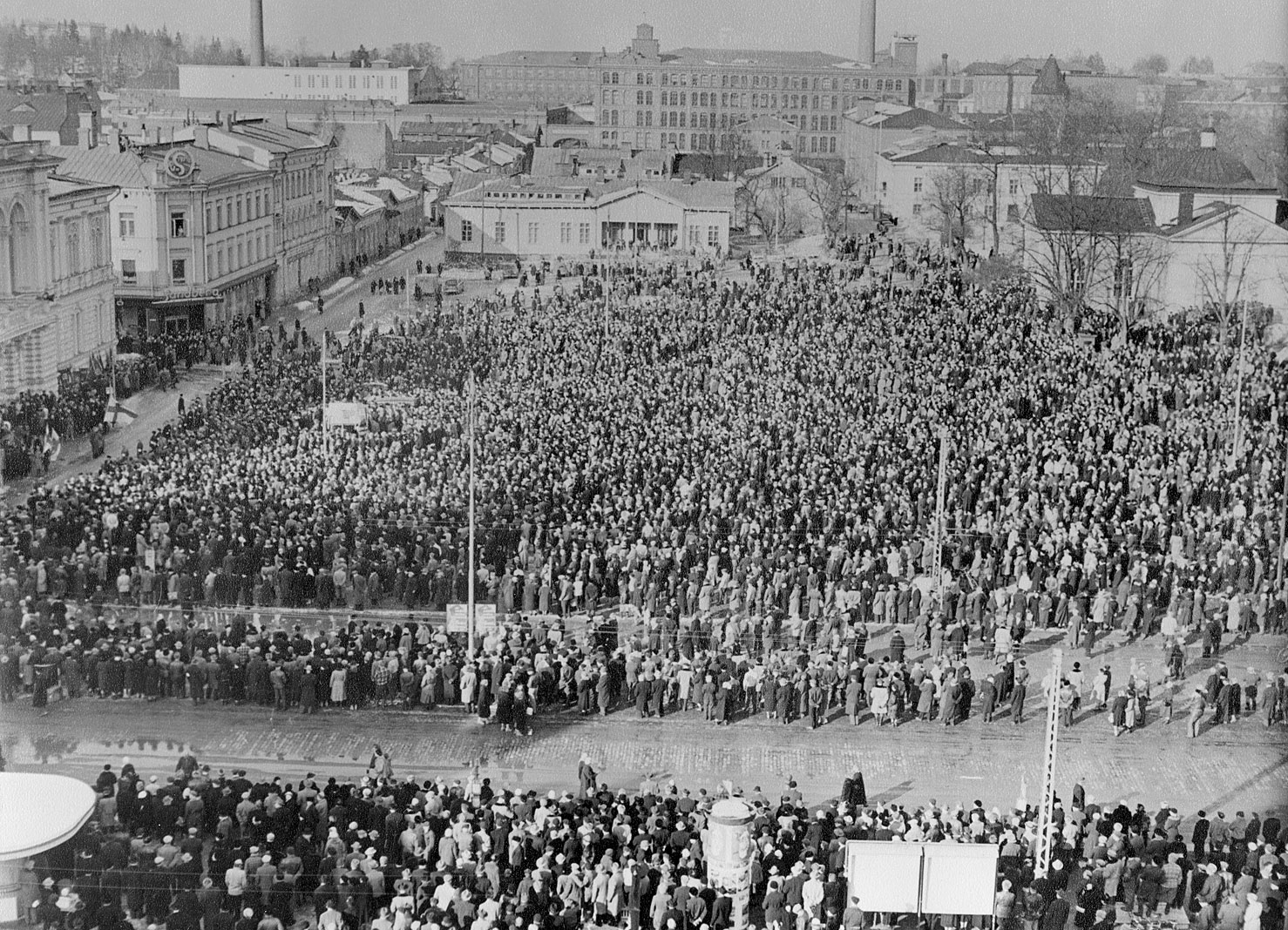 Möte på centrumtorget i Tammerfors under generalstrejken 1956.